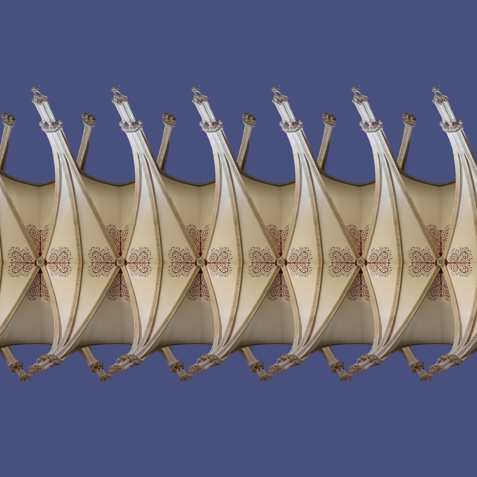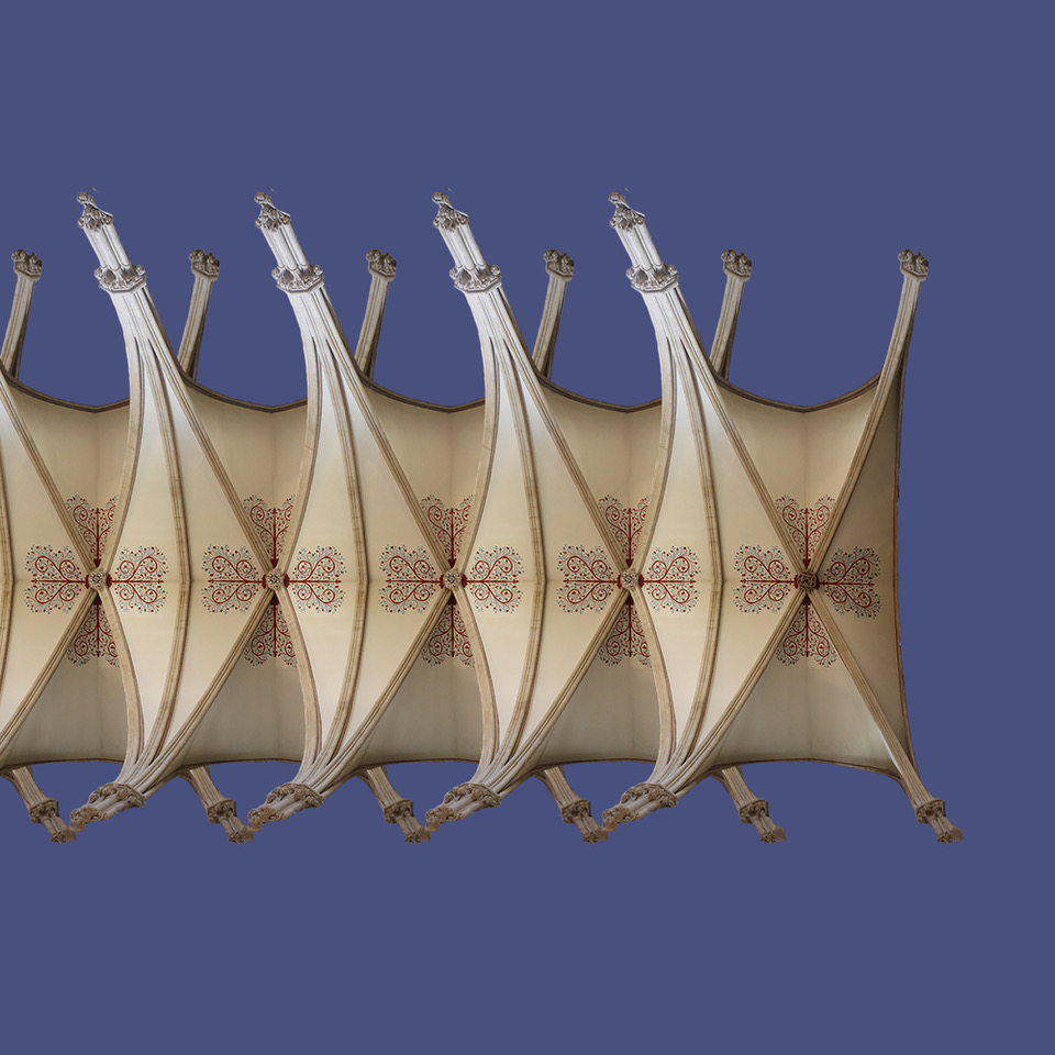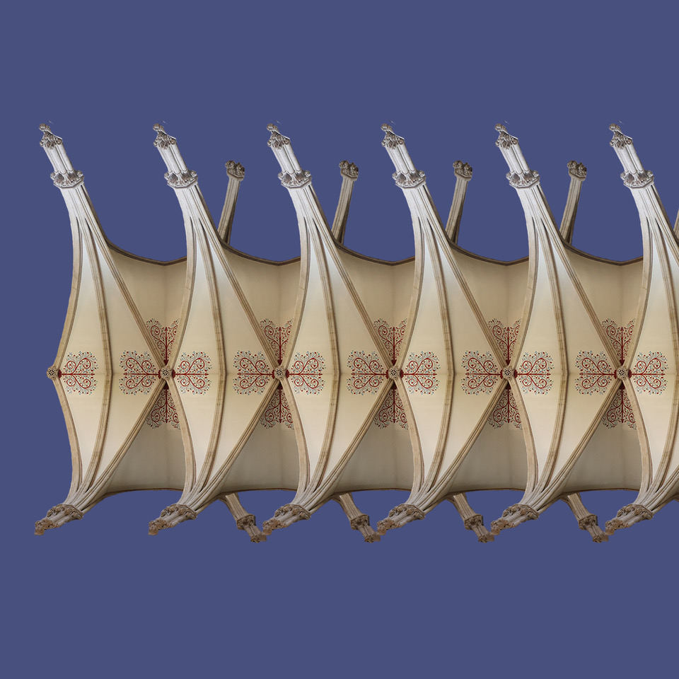 The figures are not painted in the traditional sense. They are assembled. Built from fragments of cathedral ceilings — architectures originally constructed to orient the human spirit toward something greater.